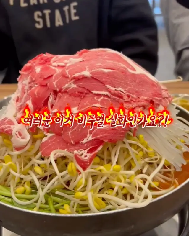 자리에 앉자마자 ‘산더미 물갈비’ 2인분을 주문했다. 잠시 후, 눈 앞에 펼쳐진 광경은 말 그대로 ‘산더미’였다. 냄비 가득 쌓인 콩나물과 미나리, 그 위에 겹겹이 쌓인 얇은 소고기의 모습은 마치 거대한 탑을 연상케 했다. 붉은 빛깔의 육수가 끓기 시작하자, 매콤한 향기가 코를 자극하며 식욕을 돋우었다. 사진으로만 보던 ‘산더미 물갈비’의 위용을 실제로 마주하니, 감탄사가 절로 나왔다.