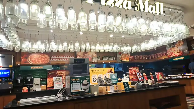매장에 들어서자마자 가장 먼저 눈에 들어온 건, 천장에 주렁주렁 매달린 독특한 조명들이었다. 마치 실험실에서나 볼 법한 유리병들이 묘하게 힙한 분위기를 자아냈다. 뷔페 공간은 생각보다 훨씬 넓었고, 테이블 간 간격도 넉넉해서 편안하게 식사를 즐길 수 있을 것 같았다. 가족 단위 손님들이 특히 많아 보였는데, 아이들을 위한 메뉴도 다양하게 준비되어 있어서 그런 것 같았다. 역시, 아이들의 입맛은 절대 속일 수 없지!