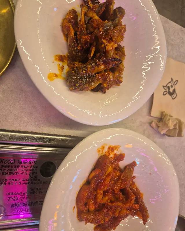 고민 끝에 삼겹살과 목살을 주문했다. 잠시 후, 테이블 위로 푸짐한 밑반찬들이 차려지기 시작했다. 에서 볼 수 있듯이, 상다리가 휘어질 정도로 다양한 반찬들이 제공되었다. 특히 나의 눈길을 사로잡은 것은 매콤달콤한 양념게장과 홍어무침이었다. 짭짤하면서도 매콤한 양념이 밴 게장은, 입맛을 돋우는 데 제격이었다. 홍어무침 역시, 톡 쏘는 홍어의 풍미와 아삭한 야채의 조화가 훌륭했다. 이 모든 것이 기본 반찬이라니, 사장님의 후한 인심에 감탄하지 않을 수 없었다.