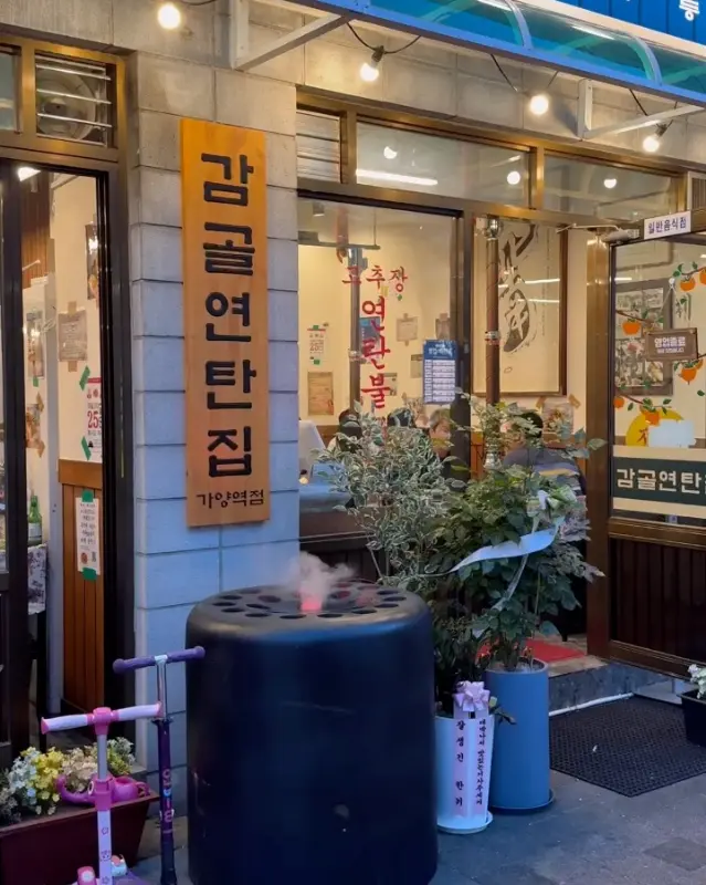 가양역 8번 출구 바로 앞에 딱 보이는 감골연탄집! 멀리서도 눈에 띄는 간판하며, 가게 앞에 놓인 연탄 조형물이 여기가 제대로 된 연탄구이집이라는 걸 온몸으로 뿜어내고 있었어. 마치 “어서 와, 연탄불에 굽는 진짜 고기 맛을 보여줄게!”라고 외치는 듯했지.
