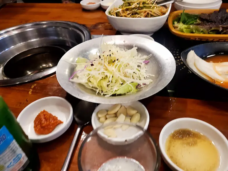 숯불이 들어오고, 곧이어 밑반찬들이 테이블 위를 가득 채웠다. 싱싱한 쌈 채소와 샐러드, 슴슴하게 익은 백김치, 그리고 따뜻한 잡채까지. 하나하나 정갈하게 담겨 나온 찬들을 보니, 주인장의 손맛과 정성이 느껴지는 듯했다. 특히, 뜨겁게 구워져 나온 김치전은 묘하게 끌리는 맛이었다. 돼지갈비가 나오기도 전에, 젓가락은 이미 쉴 새 없이 움직이고 있었다.