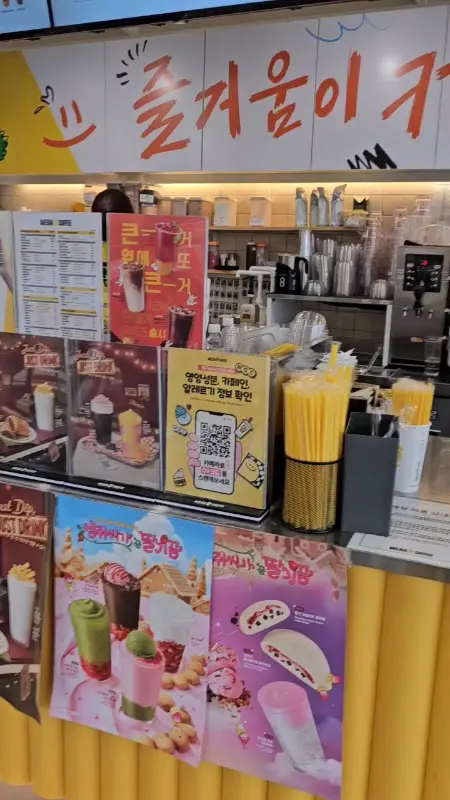 결론부터 말하자면, 이곳은 단순한 커피 판매점이 아닌, ‘가성비’라는 이름 아래 다양한 맛의 가능성을 탐구하는 작지만 혁신적인 푸드 실험실이었다. 문을 열고 들어서자 노란색 인테리어가 시각세포를 자극하며 활력을 불어넣었다. 마치 과학 실험실의 안전을 강조하는 듯한 색감이다. 머리 위 LED 패널에서는 다양한 메뉴들이 현란하게 움직이며 시각적인 향연을 펼쳤다. 마치 복잡한 화학 반응식을 보는 듯한 느낌이랄까.