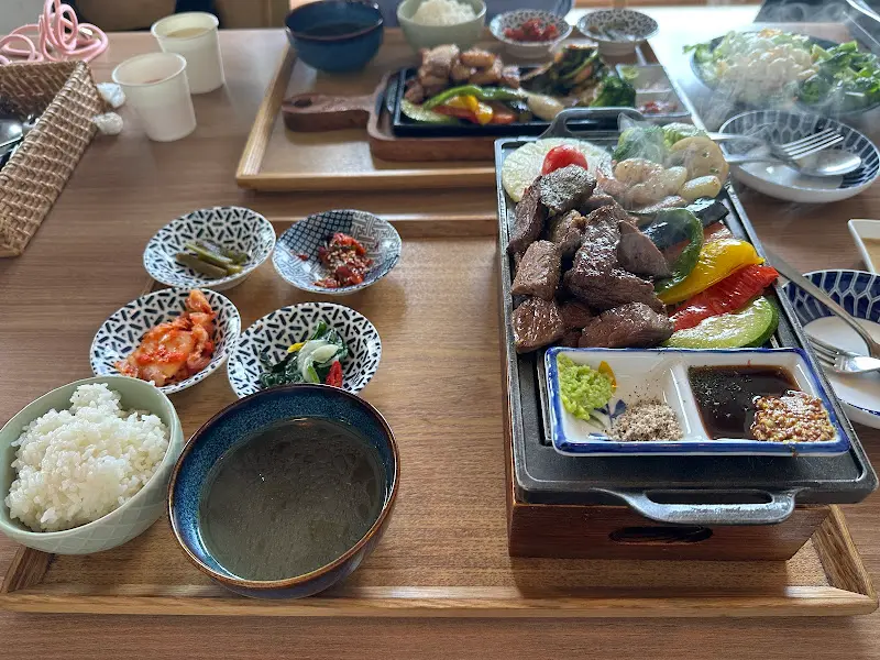 잠시 후, 정갈하게 차려진 한 상이 눈앞에 놓였다. 메인 요리인 삼겹 구운 야채는 먹음직스러운 색깔을 뽐내고 있었고, 곁들여진 반찬들도 하나하나 정성이 느껴졌다. 샐러드바에서 가져온 신선한 채소들은 싱그러움을 더했다. 이미지 속에서 보았던 것처럼, 나무 트레이 위에 올려진 메인 요리는 시각적인 즐거움까지 선사했다. 뜨겁게 달궈진 팬 위에서 지글거리는 삼겹살과 채소들은 식욕을 자극하는 향기를 풍겼다.