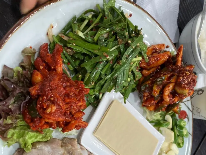 보쌈을 즐기는 동안, 테이블에는 정갈한 밑반찬들이 하나둘씩 놓였다. 묵무침, 나물, 열무김치 등 하나하나 정성이 느껴지는 맛깔스러운 반찬들이었다. 특히, 갓 지은 돌솥밥은 윤기가 좔좔 흐르는 것이 보기만 해도 식욕을 자극했다. 밥알 한 톨 한 톨이 살아있는 듯했고, 씹을수록 느껴지는 은은한 단맛은 훌륭한 밥맛을 자랑했다. 밥을 그릇에 덜어놓고 뜨거운 물을 부어 누룽지를 만들어 놓는 것도 잊지 않았다.