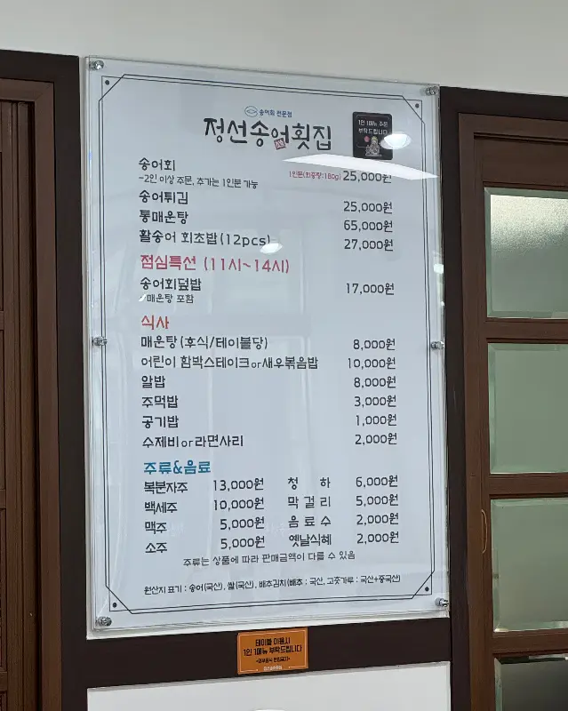 정선송어횟집에 들어서자 메뉴판이 한눈에 들어왔습니다. 메뉴는 크게 송어회, 송어튀김, 송어덮밥, 그리고 식사류로 나뉘어져 있었는데요. 가장 인기 있는 메뉴는 단연 송어회였습니다. 싱싱한 송어회는 2인 기준 50,000원, 3인은 75,000원, 4인은 100,000원으로 가격이 책정되어 있었습니다. 혼자 방문한 저는 아쉽지만 송어회덮밥(17,000원)을 선택했습니다.