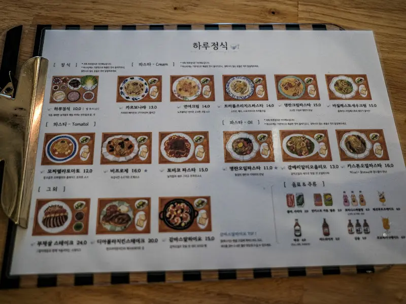 자리에 앉아 메뉴판을 펼쳐 들었다. ‘하루정식’이라는 이름에 걸맞게, 메뉴는 매일 바뀐다고 한다. 오늘의 정식은 10,000원. 가격은 살짝 있는 편이지만, 퀄리티와 맛을 생각하면 충분히 납득할 만한 가격이라고 생각했다. 동료들과 나는 오늘의 정식 4인분을 주문했다. 메뉴판에는 파스타 종류도 다양하게 준비되어 있었는데, 명란크림파스타가 특히 눈에 띄었다. 다음에는 파스타도 한번 먹어봐야겠다는 생각을 했다.