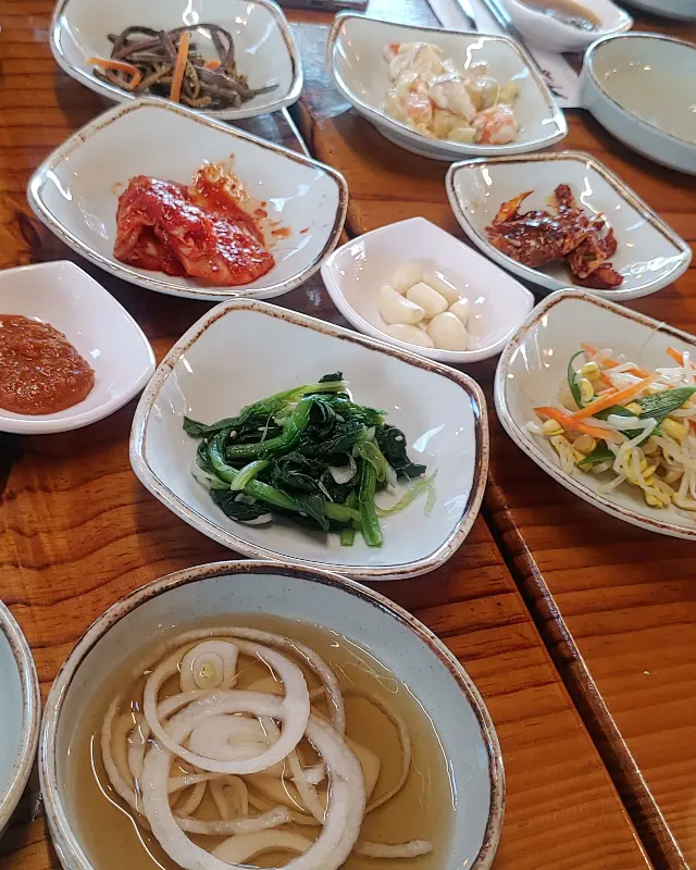 밑반찬이 먼저 나왔다. 마치 잘 짜여진 실험 설계처럼, 색감과 종류가 다채로운 반찬들이 정갈하게 차려졌다. 샐러드, 김치, 나물, 묵 등 하나하나 맛을 보니, 재료의 신선함이 그대로 느껴진다. 특히 인상적이었던 건 연근 샐러드였다. 얇게 슬라이스된 연근은 아삭아삭한 식감을 자랑했고, 상큼한 유자 드레싱은 입안을 깔끔하게 정리해줬다. 연근 속 ‘뮤신’이라는 성분은 위벽을 보호하고 소화를 돕는 효과가 있다. 메인 메뉴를 맛보기 전, 위장을 ‘코팅’해주는 완벽한 선택이었다.