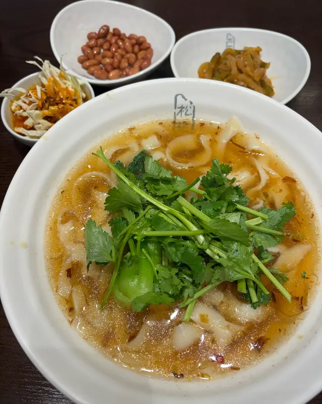 드디어 기다리고 기다리던 도삭면 등장! 큼지막한 그릇에 담겨 나온 면 요리는 보기만 해도 속이 든든해지는 비주얼이었어. 쫄깃쫄깃한 면발 위에 고소한 땅콩과 신선한 채소가 듬뿍 올라가 있었는데, 얼큰한 국물 향이 진짜 미쳤다리… 면을 한 가닥 맛보니, 쫄깃함을 넘어서 쫀득하다고 해야 하나? 면 자체가 진짜 예술이었어. 국물은 생각보다 매콤했는데, 과하게 자극적이지 않고 딱 맛있게 매운 정도!