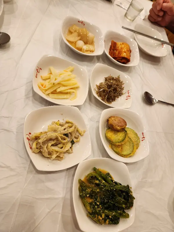 주문하고 얼마 지나지 않아 밑반찬들이 테이블에 쫙 깔렸다. 7가지나 되는 반찬들이 하나같이 정갈하고 맛있어 보였다. 콩나물 무침, 김치, 어묵볶음 등등… 솔직히 밑반찬만으로도 밥 한 공기 뚝딱할 수 있을 것 같았다. 특히 갓 담근 김치 비주얼이 장난 아니었다. 윤기가 좌르르 흐르는 게, 딱 봐도 맛있을 것 같았다.