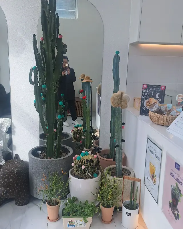 주문하고 카페를 둘러보니, 아기자기한 소품들과 편안한 의자들이 눈에 들어왔다. 2층으로 올라가는 계단 옆에는 키 큰 선인장들이 옹기종기 모여 있었는데, 마치 작은 정원에 온 듯한 느낌이었다. 곳곳에 놓인 식물 덕분인지, 카페 전체가 생기가 넘치는 듯했다.