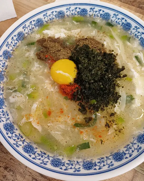 제일 먼저 시킨 건 역시 시그니처 메뉴인 칼국수였어. 진짜 비주얼부터가 남달랐어. 뽀얀 국물 위로 김가루랑 깨소금, 그리고 날달걀 노른자까지 딱 올라가 있는데, 보는 것만으로도 군침이 도는 거야. 국물을 한 숟가락 떠먹었는데, 세상에…! 맑고 깊은 동죽 베이스의 국물이 입안 가득 퍼지면서 속이 확 풀리는 느낌이었어. 전혀 짜지 않고 시원하면서도 감칠맛이 일품이었지.