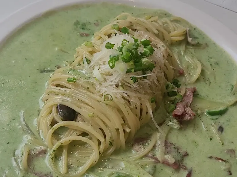 드디어 기다리고 기다리던 시금치크림 파스타가 나왔다. 뽀얀 크림소스 위에 듬뿍 올려진 시금치와 파마산 치즈, 그리고 송송 썰린 쪽파가 어우러진 모습이 정말 예술이었다. 사진으로 봤던 것보다 훨씬 더 먹음직스러운 비주얼에 감탄사가 절로 나왔다.