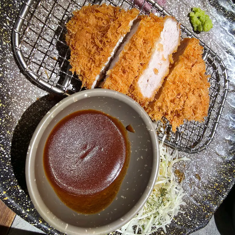 드디어 기다리고 기다리던 ‘판소바 돈카츠 세트’가 나왔다. 돈까스는 겉은 바삭하고 속은 촉촉한, 이상적인 겉바속촉의 정석이었다. 튀김옷은 얇고, 고기는 두툼해서 씹는 맛이 있었다. 돈까스 소스에 살짝 찍어 먹으니, 입안 가득 퍼지는 풍미가 정말 최고였다. 돈까스 위에 살짝 얹어진 와사비는 느끼함을 잡아주면서 깔끔한 맛을 더했다.