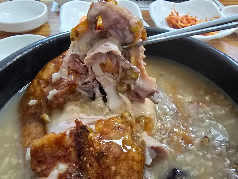 국물 한 숟갈을 떠먹으니, 깊고 진한 닭 육수의 풍미가 느껴졌어. 닭 특유의 잡내는 전혀 없고, 깔끔하면서도 담백한 맛이 일품이었지. 찹쌀과 녹두가 푹 퍼져 국물에 녹아들어, 걸쭉하면서도 부드러운 식감을 더해줬어. 마치 엄마가 정성껏 끓여준 닭죽 같은 느낌이랄까. 속이 확 풀리는 듯 시원하고 따뜻한 기운이 온몸으로 퍼져나가는 게, 정말 좋았어.