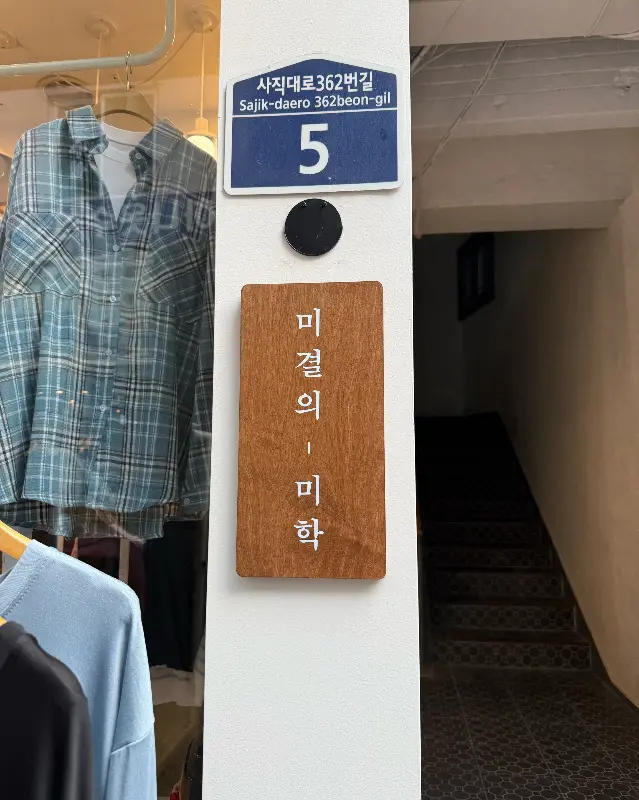 가게로 향하는 입구는 쉽게 눈에 띄지 않았다. 마치 숨겨진 보물을 찾아 나서는 듯한 기분이었다. 옷가게 옆 좁은 통로를 따라 계단을 오르니, 비로소 카페의 입구가 모습을 드러냈다. 낡은 나무 간판에 새겨진 정갈한 글씨체가, 이곳이 평범한 공간이 아님을 암시하는 듯했다.