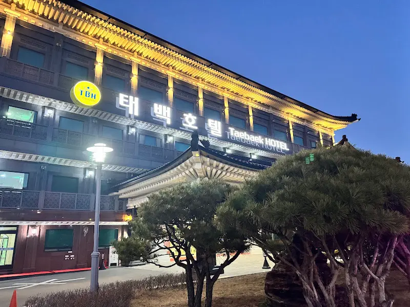 드디어 모습을 드러낸 태백호텔은 첫인상부터 압도적이었습니다. 한옥의 고풍스러움을 현대적으로 재해석한 외관은 주변의 자연과 조화롭게 어우러져 깊은 인상을 남겼습니다. 밤이 되자, 은은한 조명이 더해져 더욱 운치 있는 분위기를 자아냈습니다.