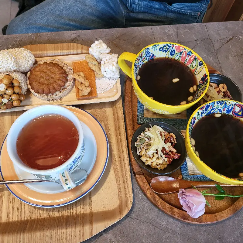 고민 끝에 나는 이곳의 대표 메뉴인 청와차(8,000원)와 할머니가 드시고 싶어 하시던 쌍화탕(7,000원)을 주문했다. 곁들여 먹을 디저트로는 청와한상(12,000원)을 선택했는데, 약과, 한과, 쌀과자 등 전통적인 다과를 맛볼 수 있다는 점이 마음에 들었다. 음료와 디저트를 기다리는 동안, 카페 내부를 둘러보며 사진도 찍고, 잠시나마 여유를 만끽했다. 잠시 후, 정갈하게 차려진 음료와 다과가 눈앞에 놓였다. 청와차는 은은한 단맛과 함께 쌍화차 특유의 깊은 풍미가 느껴졌고, 쌍화탕은 진하고 건강한 맛이 일품이었다. 특히 청와한상은 차와 함께 곁들여 먹으니, 그 맛이 더욱 조화롭게 느껴졌다. 마치 시간 여행을 떠나온 듯, 특별하고 아름다운 경험이었다.