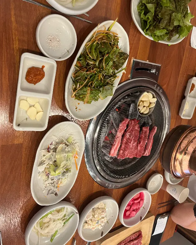 주문을 마치고 주변을 둘러보니, 테이블마다 놓인 숯불 화로가 눈에 띄었다. 숯불에 구워 먹는 고기는 언제나 옳지! 곧이어 밑반찬들이 나왔는데, 샐러드부터 시작해서 다양한 종류의 반찬들이 정갈하게 담겨 나왔다. 특히, 샐러드 소스가 독특했는데, 고소하면서도 상큼한 맛이 입맛을 돋우는 역할을 제대로 했다.