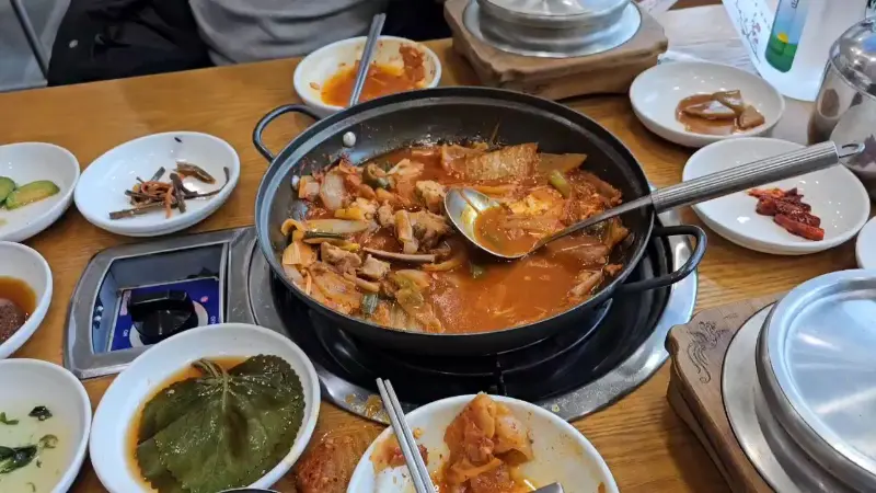 자리를 잡고 앉아 메뉴판을 훑어보니, 김치찜, 갈비찜, 두루치기 등 아주 맛깔난 메뉴들이 즐비하더라고. 뭘 먹을까 한참 고민하다가, 얼큰하고 시원한 국물이 땡겨서 돼지갈비 김치찜을 시켰어. 옆 테이블에서 먹는 더덕두루치기도 어찌나 맛깔나 보이던지, 다음에는 꼭 저걸 먹어봐야겠다 생각했지.