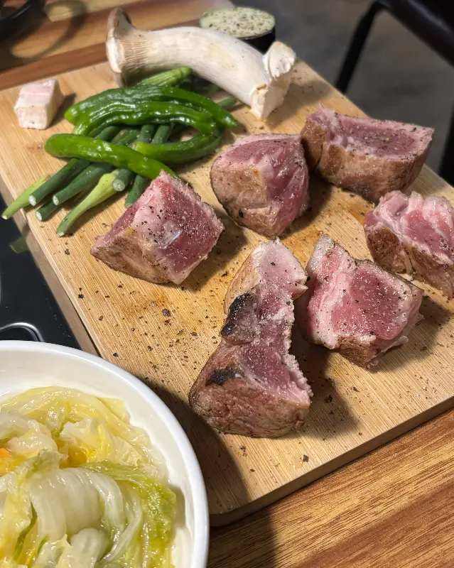 메뉴판을 보니 역시나 목살이 대표 메뉴인 것 같더라고. 목살 말고도 가브리살, 차돌박이 등 다양한 고기 메뉴가 있었지만, 다들 목살을 추천하니 우리도 목살부터 시켜보기로 했지. 고기 질이 좋다는 이야기는 익히 들었지만, 실제로 보니 그 빛깔이 정말 남다르더라. 선홍색 빛깔에 적당히 박혀있는 마블링이 신선함을 그대로 보여주는 것 같았어. 곁들여 나오는 백김치, 꽈리고추, 버섯, 마늘쫑도 얼마나 싱싱해 보이던지!