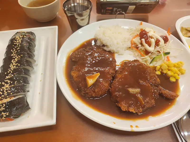 보기만 해도 푸짐한 김밥 한 접시와 윤기가 좔좔 흐르는 돈까스! 이 조합, 무조건입니다.