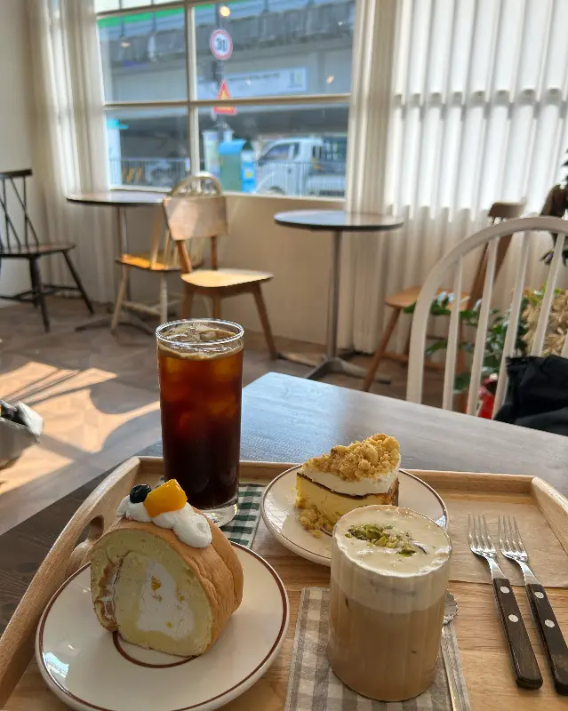 우리는 창가 자리에 앉아, 각자 원하는 음료와 디저트를 주문했다. 나는 여전히 코이라떼를, 친구는 썸머라떼를 선택했다. 디저트로는 딸기 롤케이크와 크림 브륄레 치즈케이크를 주문했다. 잠시 후, 우리가 주문한 메뉴들이 테이블 위에 놓였다.