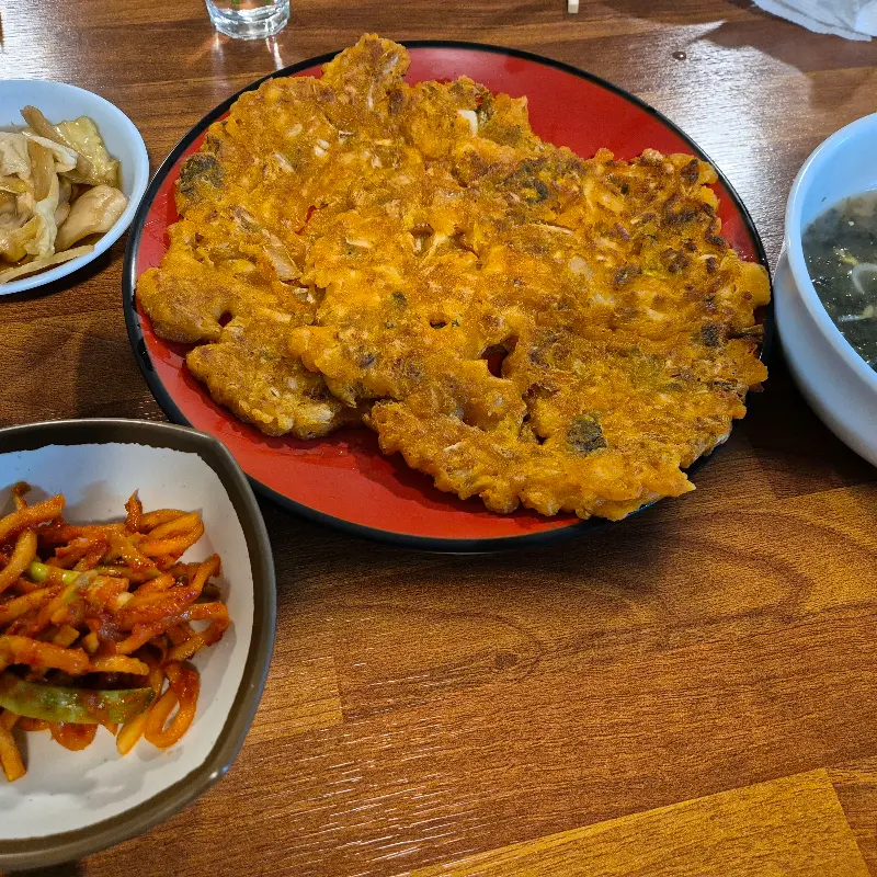 주문 후 얼마 지나지 않아, 푸짐한 음식들이 테이블 위를 가득 채웠다. 먼저 눈길을 사로잡은 것은 단연 골뱅이무침이었다. 새빨간 양념에 버무려진 골뱅이와 채소들이 산처럼 쌓여 있었고, 그 양에 압도당했다. 신선한 채소들의 아삭한 식감과 쫄깃한 골뱅이의 조화는 환상적이었다. 매콤하면서도 새콤달콤한 양념은 입맛을 돋우기에 충분했고, 먹어도 먹어도 질리지 않는 중독성이 있었다.