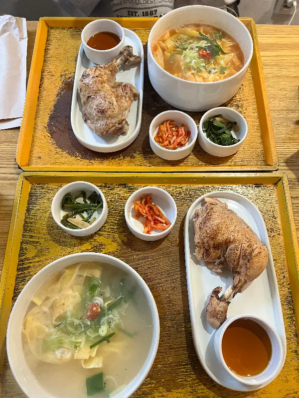 1. 우사골 온면: 뽀얀 우사골 국물에 옥수수면이 담겨 나오는 우사골 온면. 국물은 깊고 진하면서도 깔끔한 맛이 일품이었다. 옥수수면은 일반 면보다 훨씬 부드럽고 매끄러운 식감을 자랑했다. 특히, 면과 함께 곁들여 먹는 닭다리 구이는 환상적인 조화를 이루었다. 닭다리는 겉은 바삭하고 속은 촉촉하게 구워져 짭짤하면서도 고소한 맛이 났다. 닭다리 살을 발라 면과 함께 먹으니 정말 꿀맛이었다. 가격은 11,000원으로, 닭다리 구이까지 함께 제공되는 것을 고려하면 가성비도 훌륭하다고 생각한다.