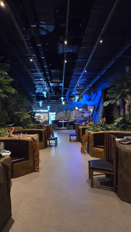 어둠이 짙게 드리운 공간, 푸른 조명이 신비로운 분위기를 자아냈다. 천장에는 공룡의 뼈대가 매달려 있었고, 벽면은 마치 실제 정글처럼 꾸며져 있었다. 테이블은 동굴 속 작은 공간처럼 아늑하게 조성되어 있었는데, 마치 탐험가가 된 듯한 설렘을 느낄 수 있었다. 아이들은 연신 “우와”를 외치며 공룡 모형을 향해 달려갔고, 어른들은 그런 아이들의 모습을 보며 미소짓고 있었다.