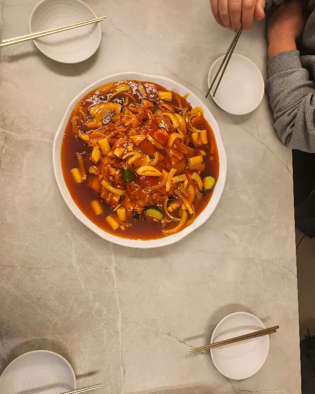 드디어 기다리고 기다리던 첫 입. 젓가락으로 듬뿍 집어 올린 김피탕을 입안에 넣는 순간, 온갖 맛들이 폭죽처럼 터져 나왔다. 바삭한 탕수육의 고소함, 아삭아삭한 양파의 신선함, 매콤하면서도 새콤한 김치의 깊은 맛, 그리고 부드럽고 쫄깃한 치즈의 풍미가 한데 어우러져 환상의 하모니를 만들어냈다. 특히, 탕수육 소스의 느끼함을 김치가 잡아주어, 전혀 질리지 않고 계속해서 먹을 수 있었다.