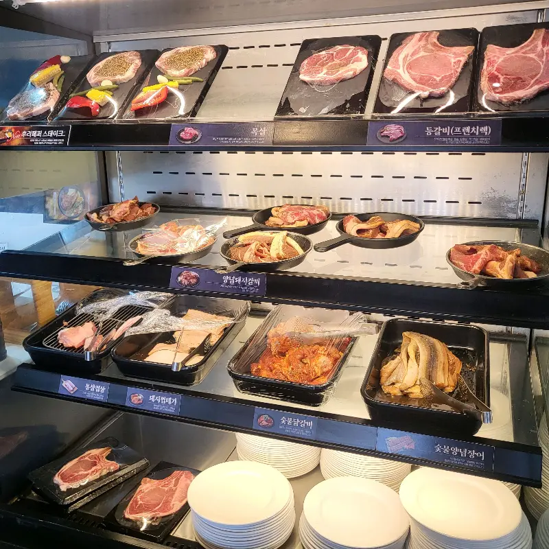 자리에 앉자마자 메뉴판을 스캔했다. 숯불돼지갈비 무한리필 1인 가격은 18,900원. 가성비 미쳤다! 게다가 돼지갈비뿐만 아니라 삼겹살, 닭갈비, 껍데기까지 즐길 수 있다니, 혼밥러에게 이보다 더 좋을 순 없다. 예전에는 양념갈비만 제공되었다고 하는데, 지금은 여러 종류의 고기를 맛볼 수 있어서 더욱 만족스럽다.