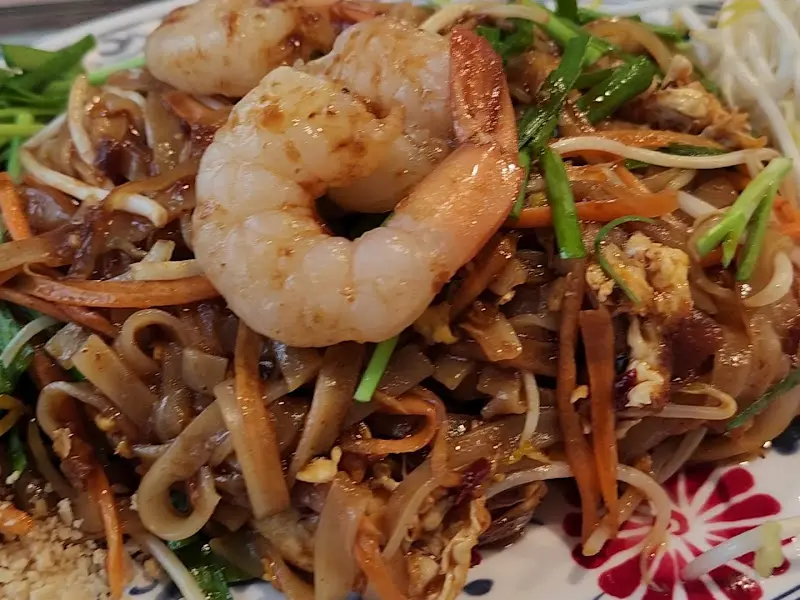 드디어 팟타이가 테이블에 놓였다. 사진으로 보던 것보다 훨씬 푸짐한 양에 놀랐다. 접시 가득 담긴 팟타이 위에는 통통한 새우와 잘게 부순 땅콩이 넉넉하게 뿌려져 있었다. 팟타이 특유의 달콤하면서도 새콤한 향이 코를 자극했다. 에서 보았던 큼지막한 새우의 자태는, 보는 것만으로도 군침이 돌게 했다.