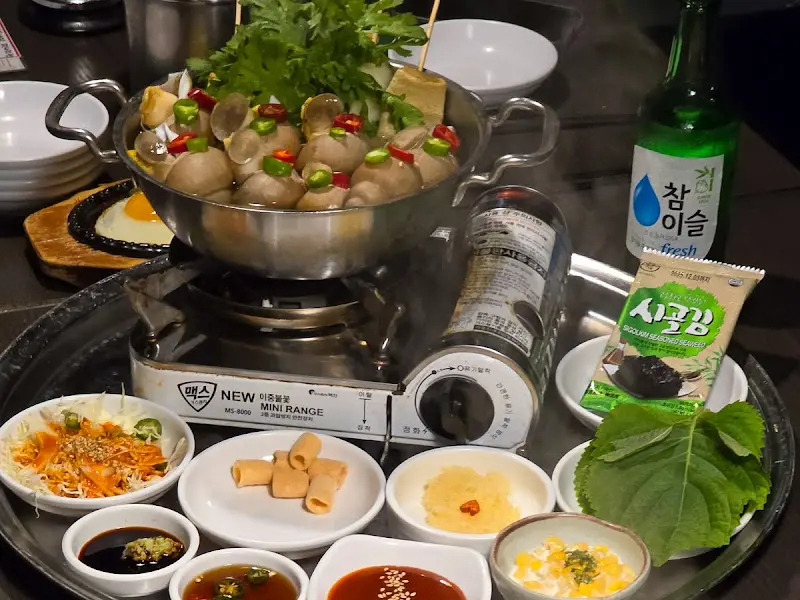 * 백골뱅이탕 (28,000원): 민생주의 시그니처 메뉴라고 할 수 있는 백골뱅이탕은 큼지막한 냄비에 푸짐하게 담겨 나왔습니다. 뽀얀 국물 위로 솟아오른 백골뱅이들의 자태는 보기만 해도 군침이 돌았습니다. 국물은 시원하면서도 깊은 맛이 일품이었고, 쫄깃한 백골뱅이는 씹을수록 고소한 풍미가 느껴졌습니다. 특히, 백골뱅이탕에 함께 들어있는 물떡과 오뎅은 묘한 조화를 이루며 색다른 재미를 선사했습니다. 마치 어릴 적 먹던 분식의 고급 버전이라고나 할까요? 따뜻한 국물과 함께 즐기는 물떡과 오뎅은 술안주로도, 식사 대용으로도 손색이 없었습니다. 을 보면, 끓고 있는 백골뱅이탕과 함께 기본으로 제공되는 계란후라이, 깻잎, 쌈무 등이 한상 가득 차려진 모습이 인상적입니다. 다양한 곁들임 메뉴 덕분에 백골뱅이탕을 더욱 풍성하게 즐길 수 있었습니다.