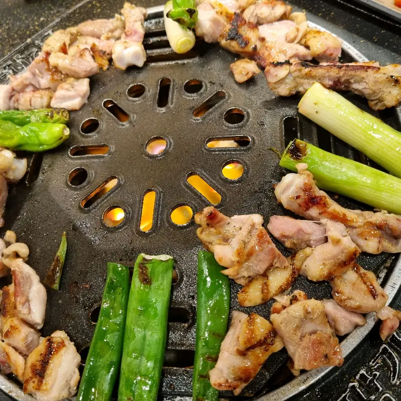 숯불 위에서 맛있게 익어가는 닭갈비와 채소