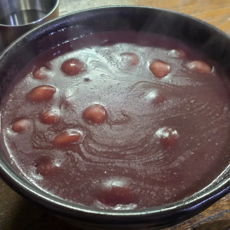 자리에 앉아 메뉴를 살펴보니, 팥칼국수와 팥죽을 드시는 분들이 압도적으로 많았습니다. 팥죽의 향긋한 냄새에 이끌려 저도 팥죽을 주문하기로 했습니다. 잠시 후, 김이 모락모락 나는 팥죽이 제 앞에 놓였습니다.