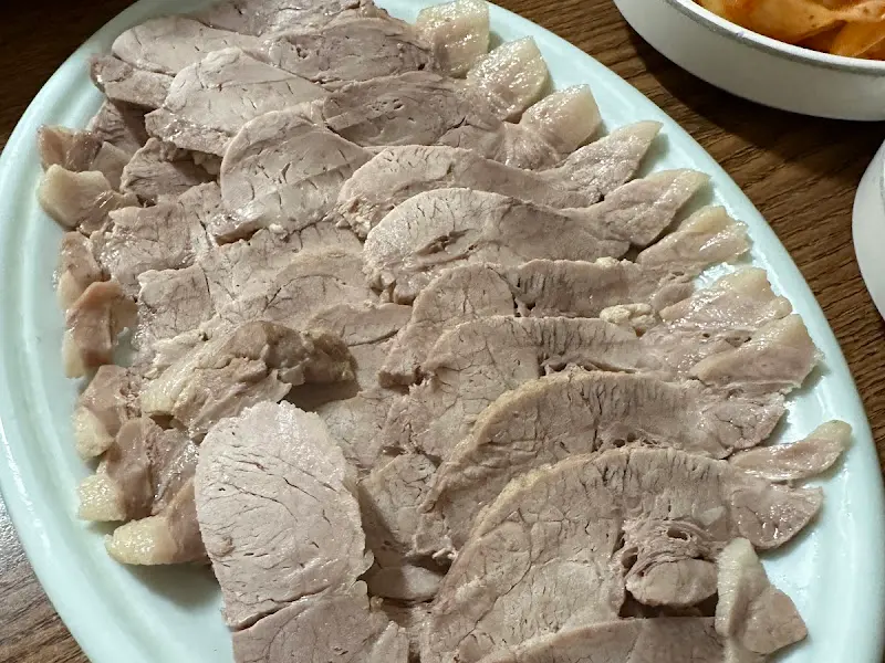 에서 보이는 편육은 얇게 썰어져 윤기가 자르르 흘렀다. 젓가락으로 조심스럽게 한 점을 집어 입에 넣으니, 부드러운 식감과 함께 돼지고기 특유의 풍미가 입안 가득 퍼져 나갔다. 돼지 특유의 잡내는 전혀 느껴지지 않았고, 담백하면서도 고소한 맛이 일품이었다. 곁들여 나온 새우젓과 함께 먹으니, 감칠맛이 더욱 살아났다.