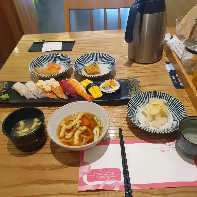 초밥을 먹는 중간중간 따뜻한 우동을 마시니 입안이 개운해지는 느낌이었다. 쫄깃한 면발과 시원한 국물이 잘 어울렸다. 특히 유부의 달콤함이 더해져 더욱 풍성한 맛을 느낄 수 있었다. 초밥과 우동의 조합은 정말 최고였다.