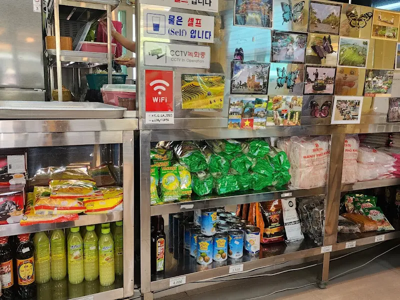 문을 열고 안으로 들어서자, 깔끔하게 정돈된 공간이 눈에 들어왔다. 스테인리스 선반에는 베트남 식료품들이 진열되어 있었는데, 알록달록한 포장지의 제품들이 이국적인 분위기를 더했다. 한쪽 벽면에는 베트남 풍경 사진들이 붙어 있어 마치 작은 베트남에 온 듯한 느낌을 받았다.