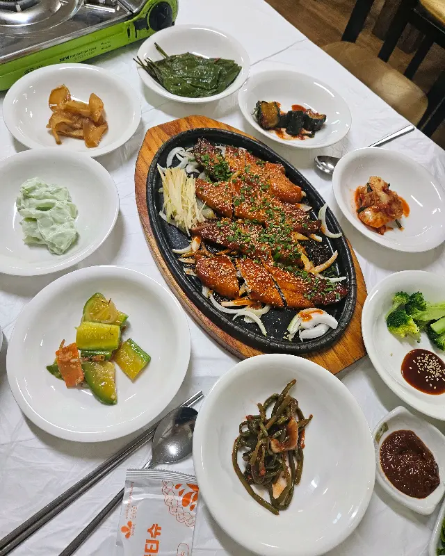 메기구이를 주문하자, 곧 정갈한 밑반찬들이 테이블 위에 차려졌다. 놋그릇에 담긴 반찬들은 하나하나 정성이 느껴졌고, 특히 쌉쌀하면서도 향긋한 도토리묵은 입맛을 돋우기에 충분했다.
