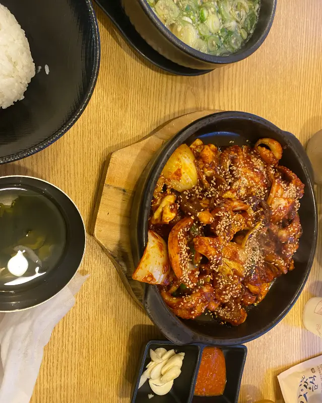 조촌이층집에 도착하니 역시나 예상대로 웨이팅이 있었다. 하지만 세련되고 깔끔한 외관 덕분에 기다리는 시간마저 지루하지 않았다. 드디어 내 차례가 되어 안으로 들어서자, 활기찬 분위기와 맛있는 냄새가 코를 자극했다. 메뉴판을 펼쳐 들고 고민에 빠졌다. 쭈꾸미볶음은 당연히 먹어야 하고, 흑돼지두루치기도 맛있다는 후기가 많았기 때문이다. 결국, 쭈꾸미볶음(보통맛)과 흑돼지두루치기를 모두 주문하고, 조촌이층집의 숨은 공신이라는 폭탄 계란찜까지 추가했다.
