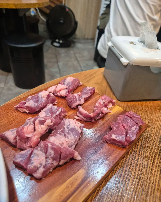메뉴판을 펼쳐 들자, 다양한 부위의 고기들이 나를 유혹했다. 갈매기살, 생갈매기살, 양념갈매기살… 고민 끝에 나는 이 집의 대표 메뉴라는 생갈매기살을 주문했다. 잠시 후, 숯불이 놓이고, 기다란 나무 도마 위에 썰어낸 생갈매기살이 등장했다. 선홍빛 육질에 섬세하게 칼집이 들어가 있는 모습이, 보기만 해도 신선함이 느껴졌다.
