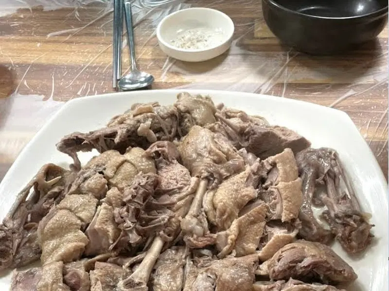 커다란 접시 가득 담긴 오리 고기는 그 뽀얀 자태를 뽐내며 시각적인 만족감을 선사했다. 섬세하게 발골된 오리 다리 하나를 집어 들었다. 겉은 촉촉하고 속은 야들야들한 것이, 완벽한 콜라겐과 엘라스틴의 조화를 이루고 있음을 짐작게 한다. 젓가락으로 살짝 건드려보니, 결대로 찢어지는 부드러움이란!