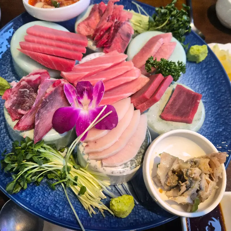 드디어 메인 메뉴 등장! 우리는 ‘특스페셜’을 시켰는데, 비주얼부터 압도적이었다. 윤기가 좔좔 흐르는 참치 때깔 좀 보소… 사장님께서 직접 부위별로 설명해주시는데, 완전 참치에 대한 자부심이 느껴졌다. 해동 상태도 예술! 입에 넣자마자 사르르 녹아내리는 게, 진짜 신선함이 그대로 느껴졌다.