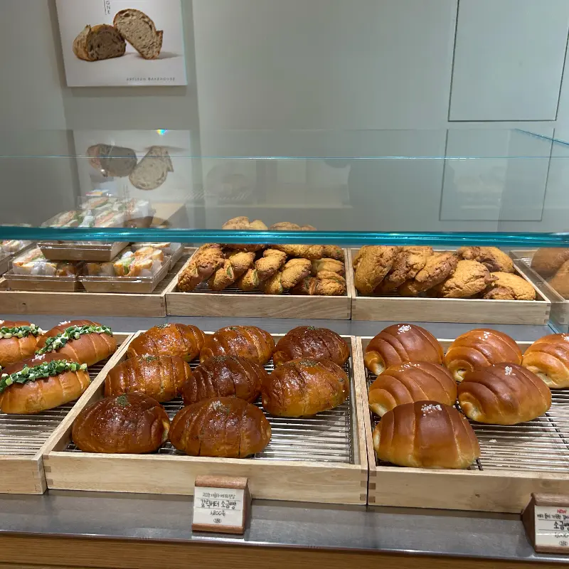 진열대 안에는 갓 구워져 나온 듯한 빵들이 저마다의 매력을 뽐내고 있었다. 윤기가 자르르 흐르는 소금빵부터, 큼지막한 크기의 치아바타, 그리고 달콤한 향을 풍기는 단팥빵까지. 빵들의 향연에 정신을 놓고 하나하나 구경하며 어떤 빵을 골라야 할지 행복한 고민에 빠졌다.