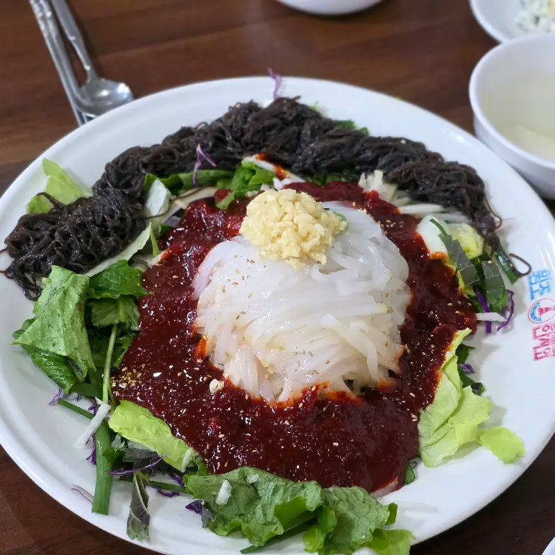 싱싱한 한치를 듬뿍 넣어 매콤새콤하게 무쳐낸 대표 메뉴다. 쫄깃한 한치와 아삭한 채소의 조화가 환상적이다. 특히, 34년 내공의 비법 양념이 맛의 핵심이다. 너무 달지도, 맵지도 않은 딱 좋은 균형을 이루어 한치의 신선함을 더욱 돋보이게 한다. 사진에서 볼 수 있듯이, 붉은 양념이 윤기를 좔좔 흐르며 침샘을 자극한다. 검은색 쫄면과 함께 제공되어 다채로운 식감을 즐길 수 있다는 점도 매력적이다. 깻잎에 싸 먹으면 향긋함까지 더해져 더욱 풍성한 맛을 느낄 수 있다. 개인적으로 생김에 얹어 먹어도 환상적일 것 같다는 생각이 들었다. 다음 방문 때는 꼭 생김을 요청해봐야겠다.