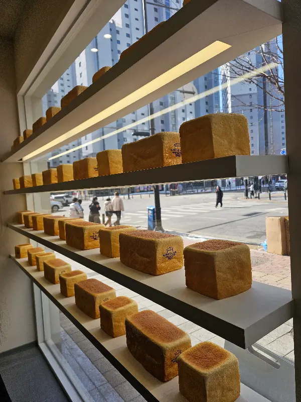 드디어 내 차례가 왔다. 문이 열리고, 따스한 온기가 온몸을 감쌌다. 작지만 깔끔한 매장 안은 갓 구워져 나온 식빵들로 가득했다. 가지런히 정돈된 식빵들의 모습은 마치 예술 작품을 전시해 놓은 듯했다. 은은한 조명 아래 놓인 빵들은 저마다 황금빛 자태를 뽐내고 있었다.