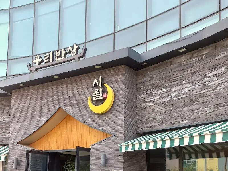 멀리서부터 눈에 띄는 ‘시월’의 외관은 모던하면서도 한국적인 멋이 느껴졌다. 회색 벽돌과 나무색 지붕의 조화가 세련되면서도 따뜻한 인상을 주더라. 건물 위쪽에 자리 잡은 “우리반상”이라는 간판과 달을 형상화한 노란색 로고도 눈에 확 들어왔어. 초록색과 흰색 스트라이프 어닝이 쳐진 창밖으로 보이는 풍경도 왠지 모르게 기대감을 불러일으켰지. 얼른 안으로 들어가고 싶어졌다.