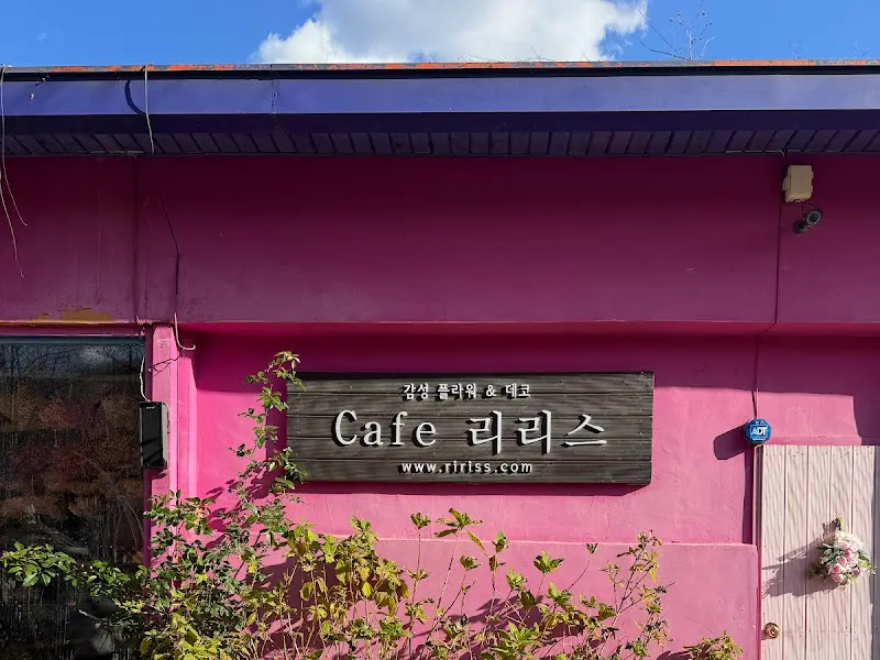 카페 외관부터 핑크 펀치! 완전 시선 강탈. ‘Cafe 리리스’ 나무 간판, 힙스터 바이브 제대로. 문 열고 들어가니, 진짜 꽃밭이 펼쳐지네.