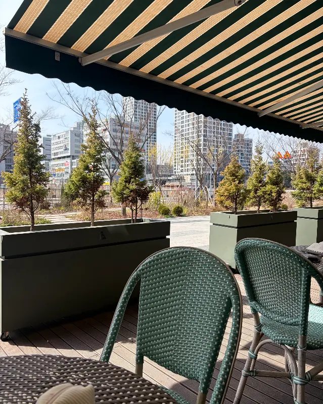 주문을 마치고 기다리는 동안, 카페 내부를 좀 더 둘러보았다. 한쪽 벽면에는 커다란 거울이 설치되어 있었는데, 덕분에 공간이 더욱 넓어 보이는 효과가 있었다. 곳곳에 놓인 화분들은 싱그러움을 더하며 생기를 불어넣고 있었다. 특히 마음에 들었던 건 창밖으로 보이는 풍경이었다. 푸르른 나무들과 멀리 보이는 건물들이 어우러져 한 폭의 그림 같은 풍경을 선사했다.