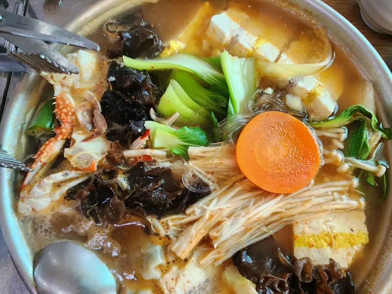 에 있는 해물 육수 뚝배기도 빼놓을 수 없어. 오징어, 바지락, 작은 게 등 다양한 해물이 들어가 시원하면서도 깊은 맛을 내는 육수가 일품이었어. 당면, 목이버섯, 팽이버섯, 청경채 등 건더기도 푸짐하게 들어 있어서, 밥과 함께 먹으니 정말 든든했지. 숟가락으로 국물을 떠먹을 때마다, 몸속까지 따뜻해지는 기분이었어.